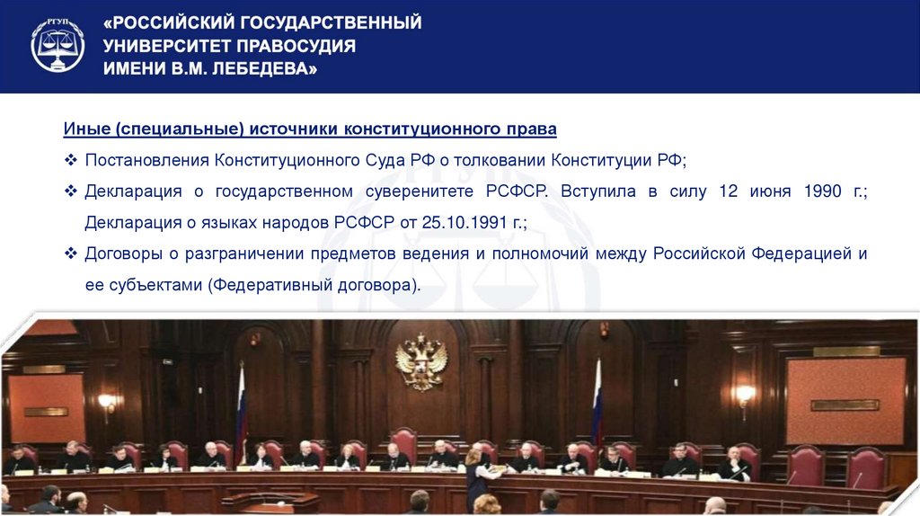 Иные (специальные) источники конституционного праваПостановления Конституционного Суда РФ о толковании Конституции РФ;