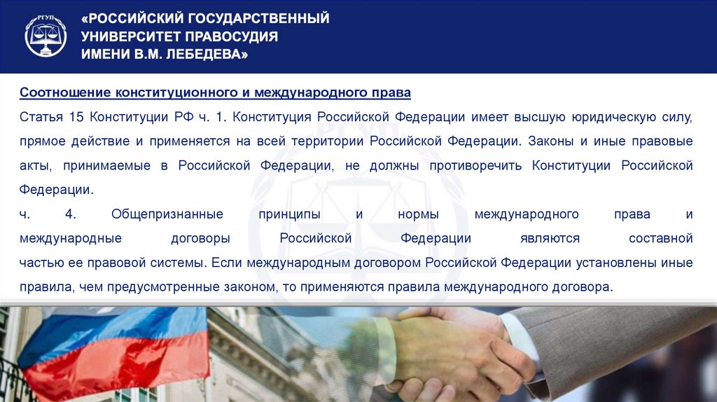 Соотношение конституционного и международного праваСтатья 15 Конституции РФ ч. 1. Конституция Российской Федерации имеет высшую юридическую силу,