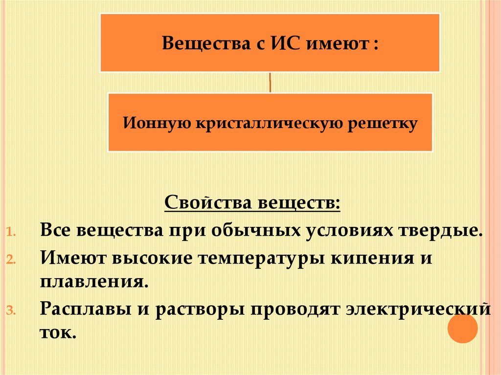 Вещества с ИС имеют :Ионную кристаллическую решетку