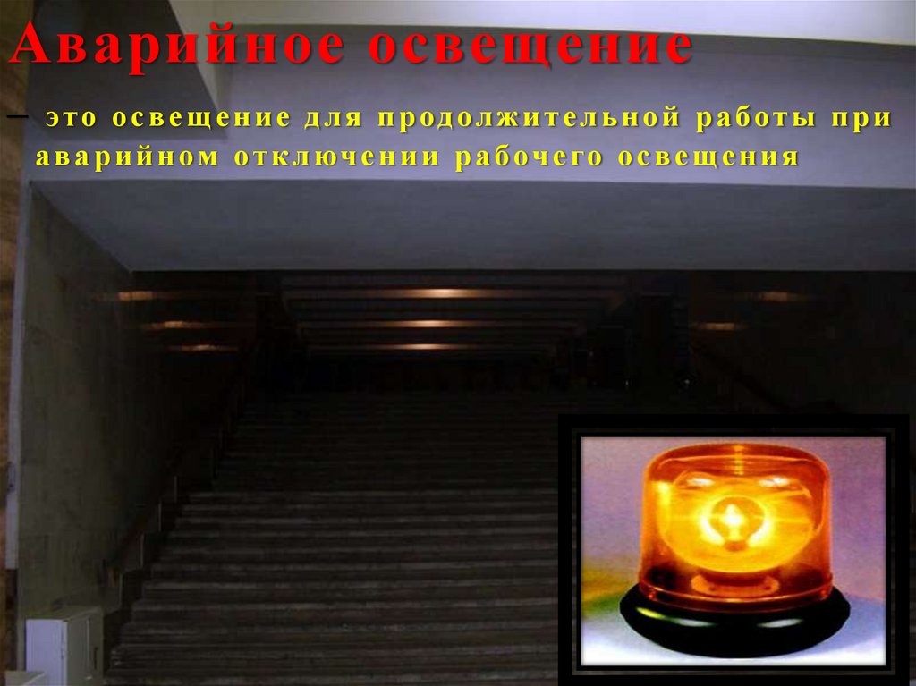 Аварийное освещение– э т о о с в е щ е н и е д л я п р од о л ж и т е л ь н о й р а б о т ы п р и