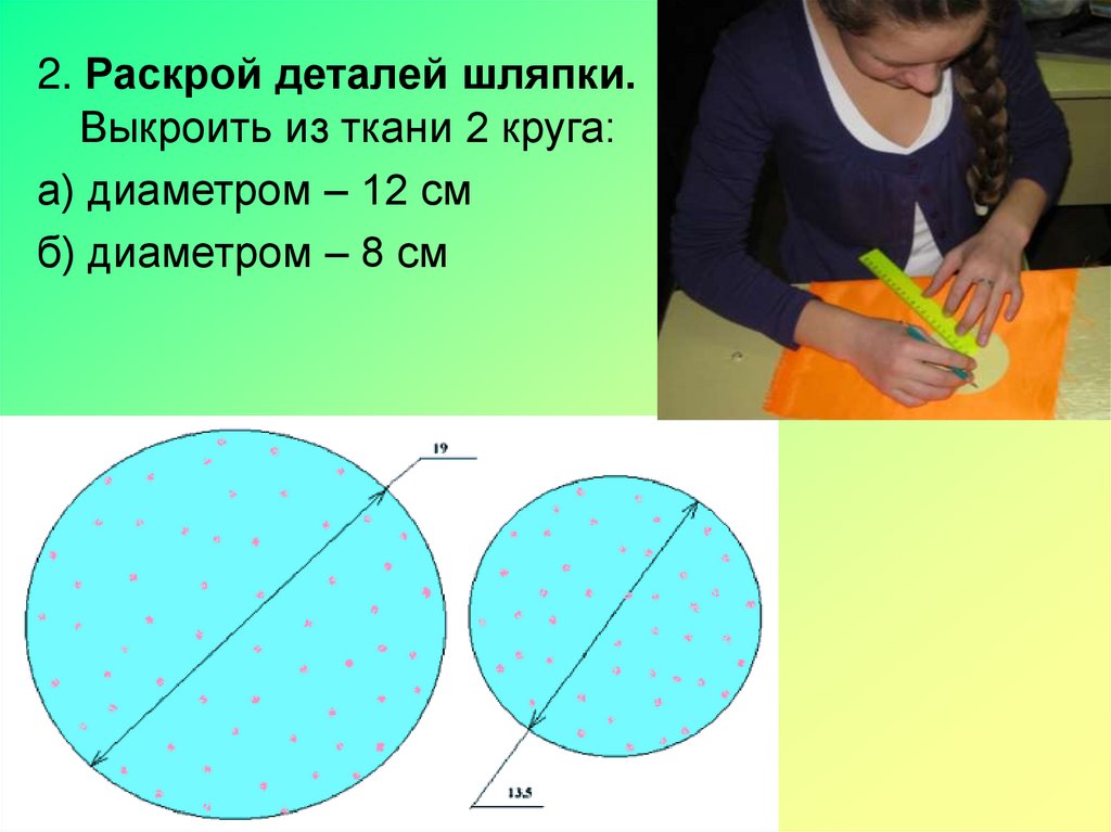 2. Раскрой деталей шляпки.Выкроить из ткани 2 круга: