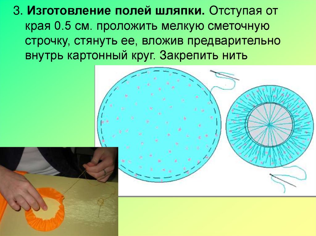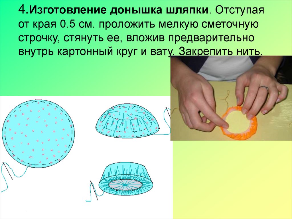 4.Изготовление донышка шляпки. Отступаяот края 0.5 см. проложить мелкую сметочную