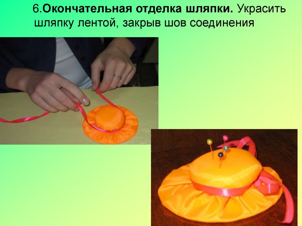 6.Окончательная отделка шляпки. Украситьшляпку лентой, закрыв шов соединения