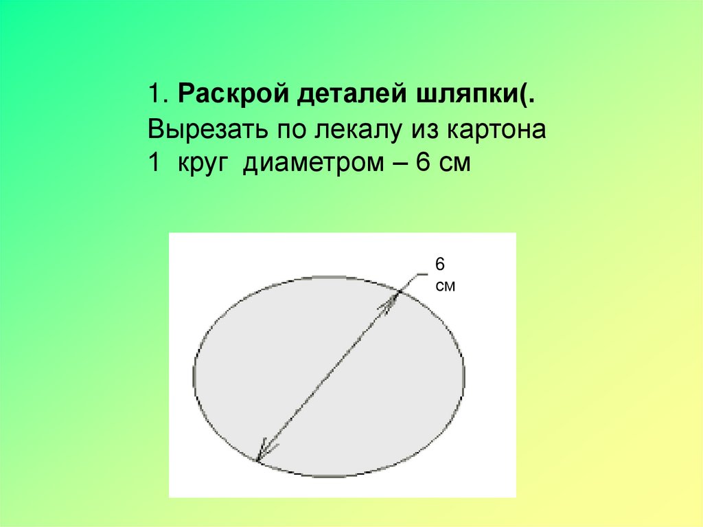 10. 1. Раскрой деталей шляпки(. Вырезать по лекалу из картона 1 круг диаметром – 6 см