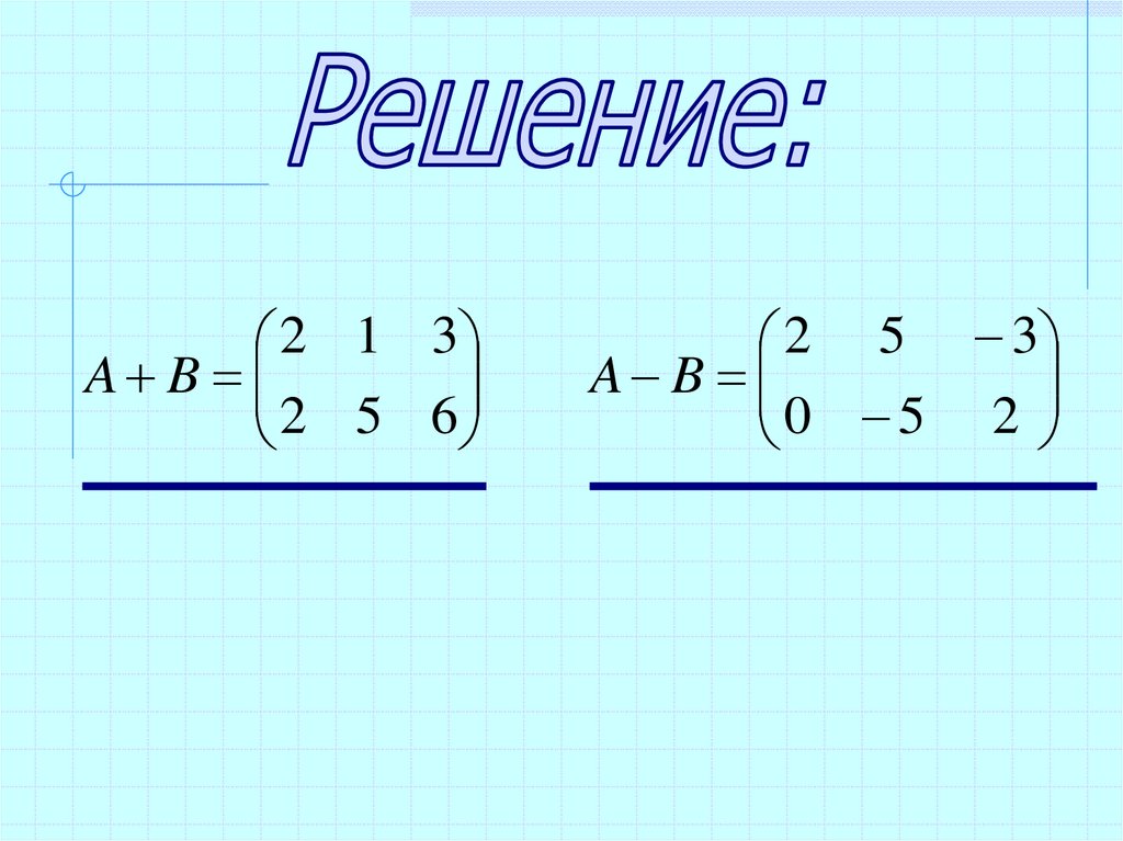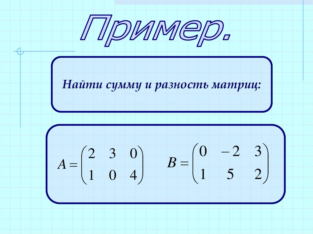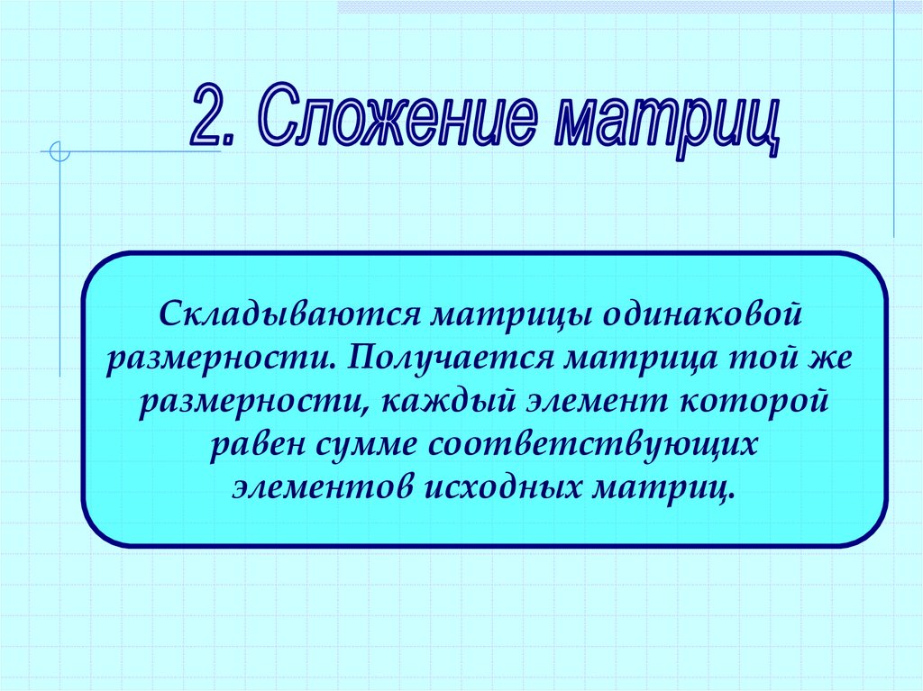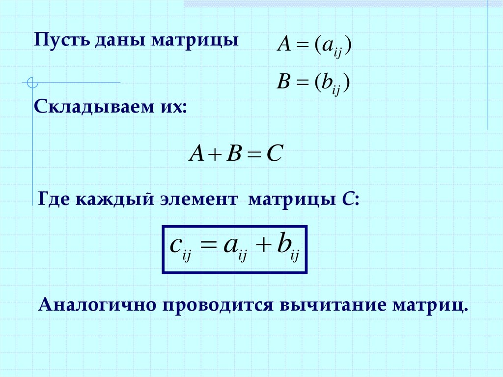 Складываются матрицы одинаковойразмерности. Получается матрица той же
