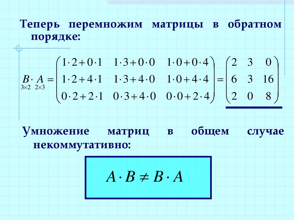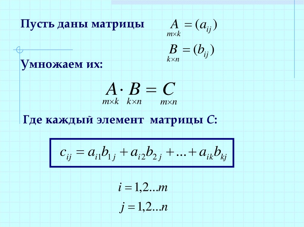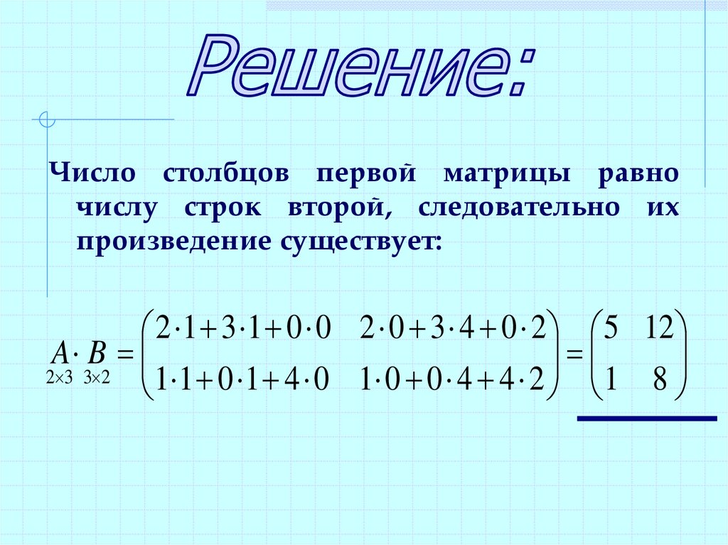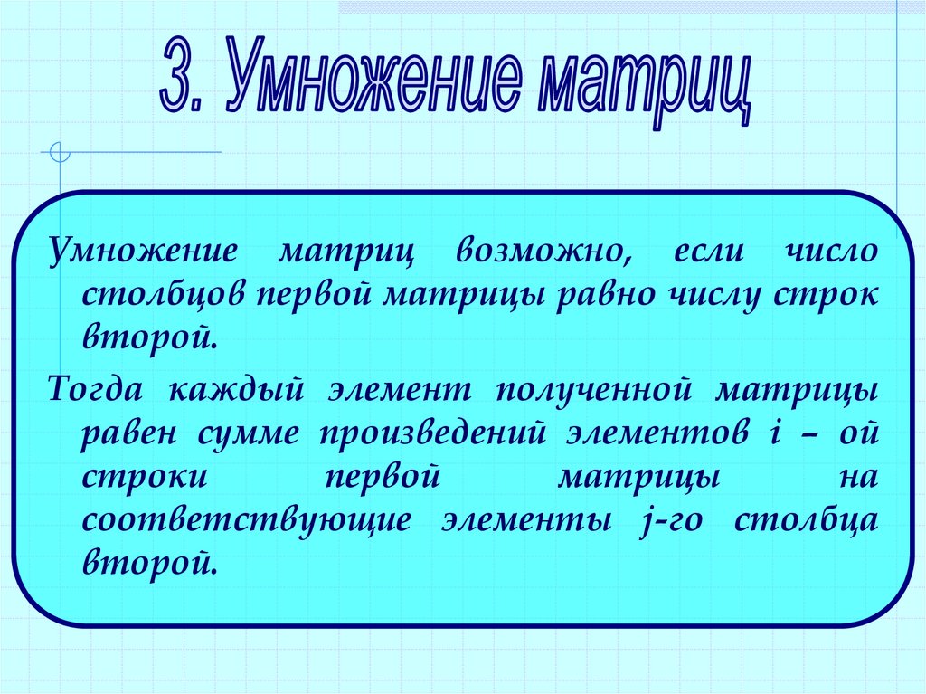 Умножение матриц возможно, если числостолбцов первой матрицы равно числу строк