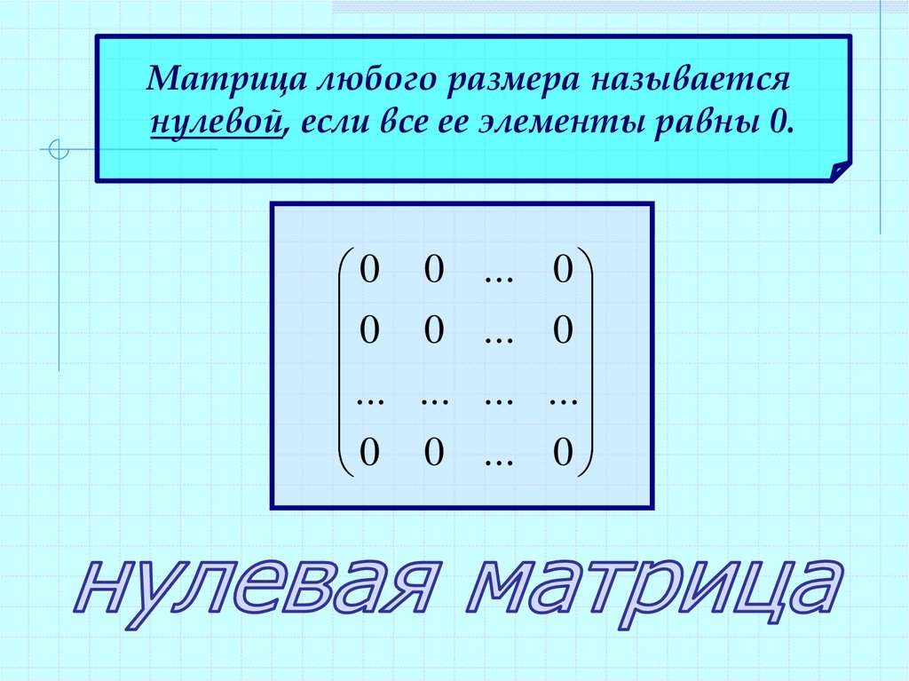Матрица любого размера называетсянулевой, если все ее элементы равны 0.