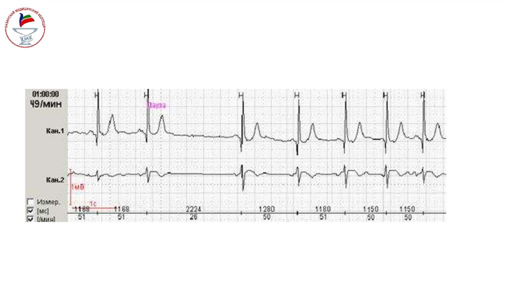 • Симптомы, характерные для брадикардий, могут появляться убольного лишь при выпадении нескольких синусовых циклов,