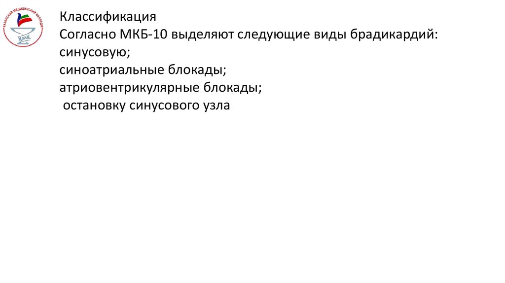 КлассификацияСогласно МКБ-10 выделяют следующие виды брадикардий: