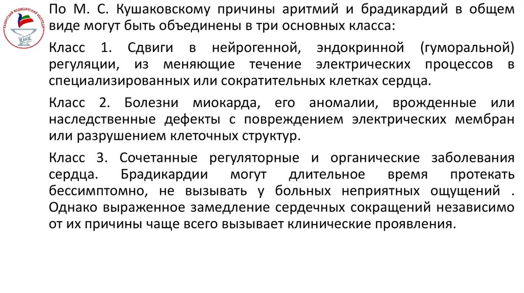 По М. С. Кушаковскому причины аритмий и брадикардий в общемвиде могут быть объединены в три основных класса: