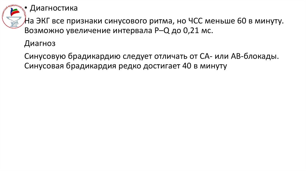• ДиагностикаНа ЭКГ все признаки синусового ритма, но ЧСС меньше 60 в минуту.
