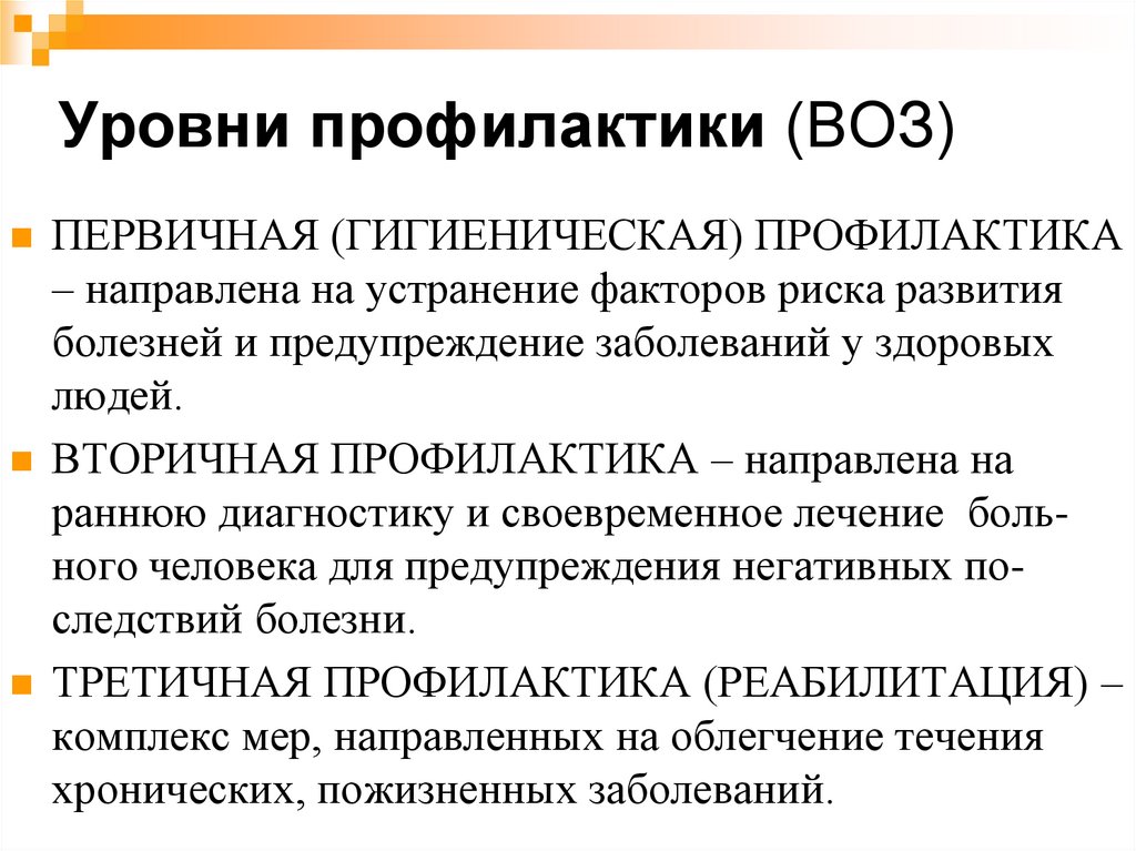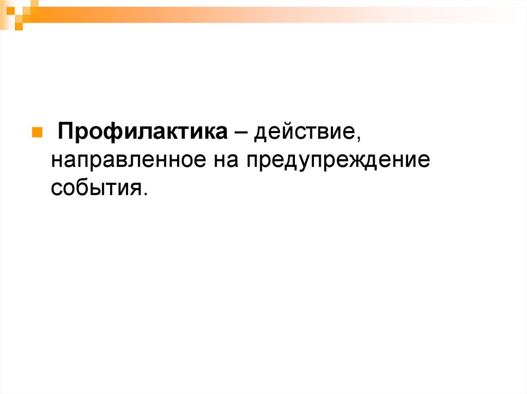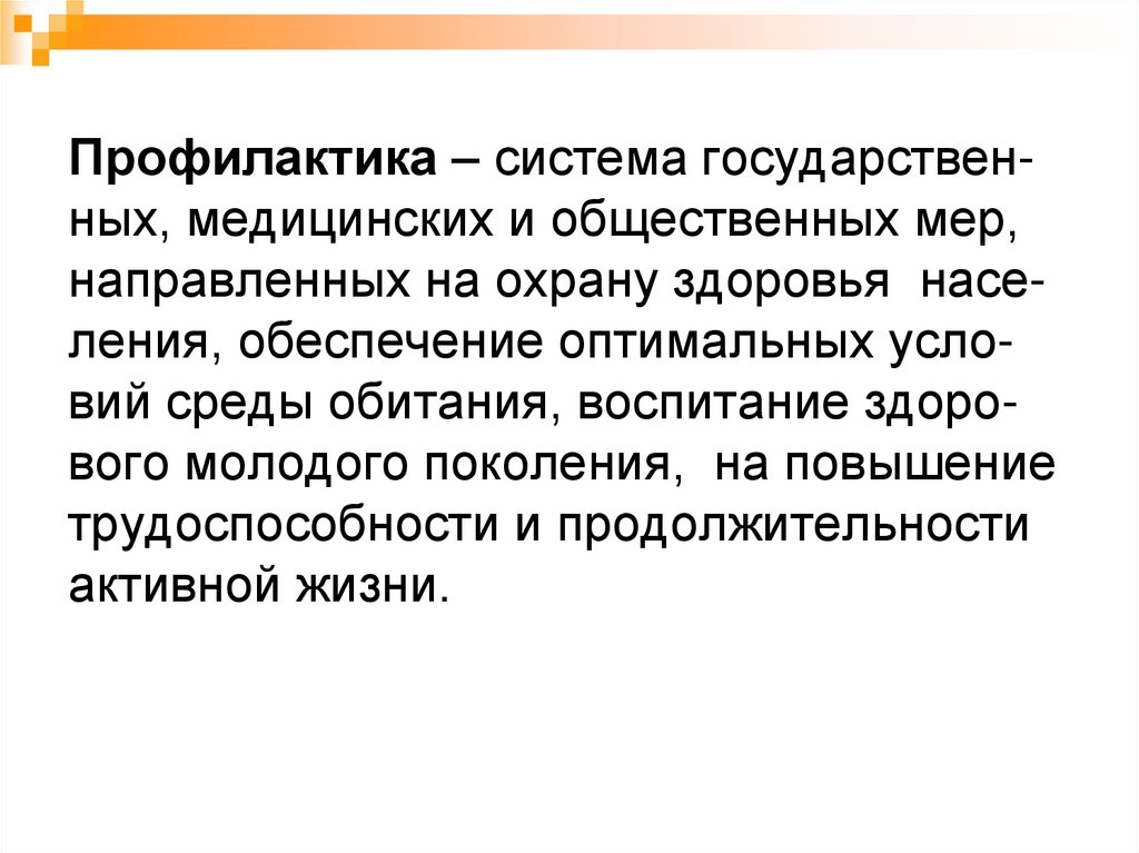 Профилактика – система государственных, медицинских и общественных мер,направленных на охрану здоровья населения, обеспечение оптимальных условий среды обитания, воспитание здорового молодого поколения, на повышение