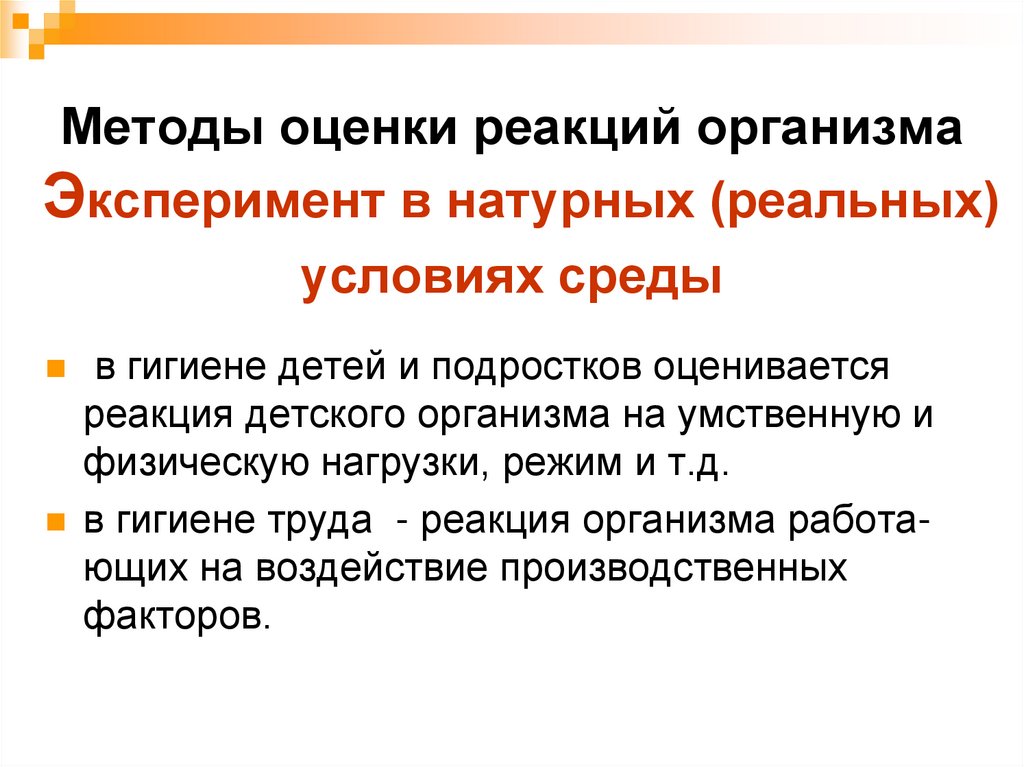 23. Методы оценки реакций организма Эксперимент в натурных (реальных) условиях среды