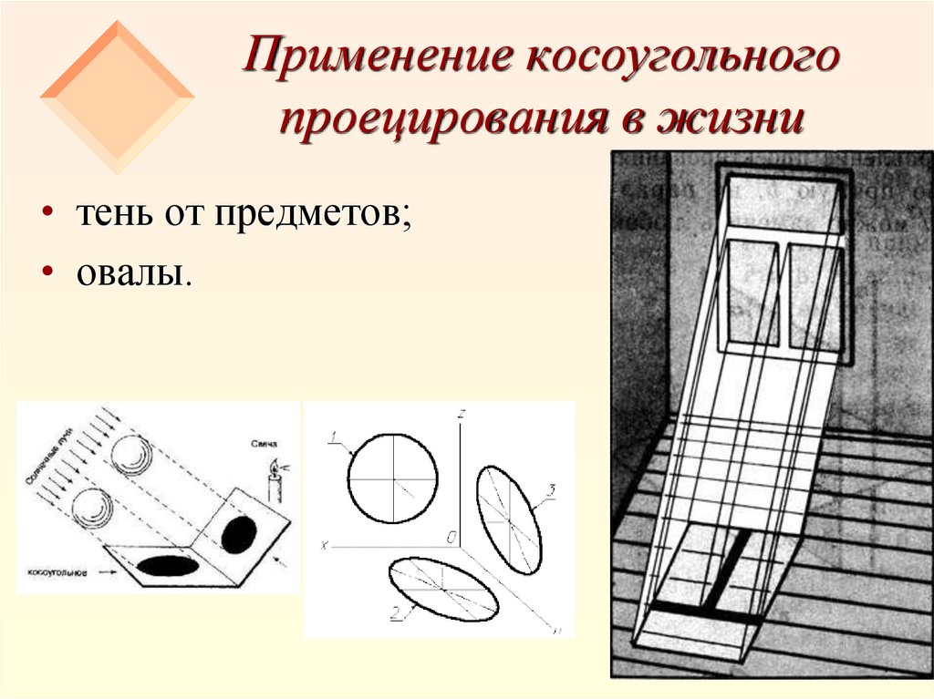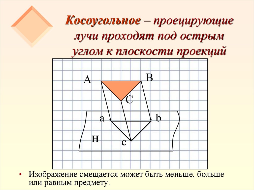 8. Косоугольное – проецирующие лучи проходят под острым углом к плоскости проекций