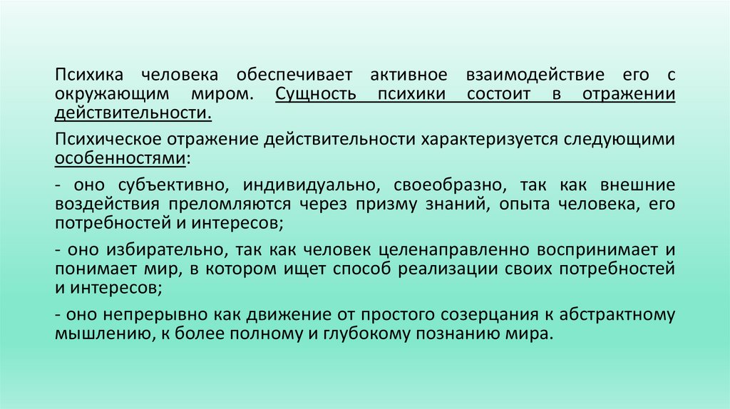 Психика – особое свойство, присущее живым организмам,основанное на высшей нервной деятельности и выражающееся в