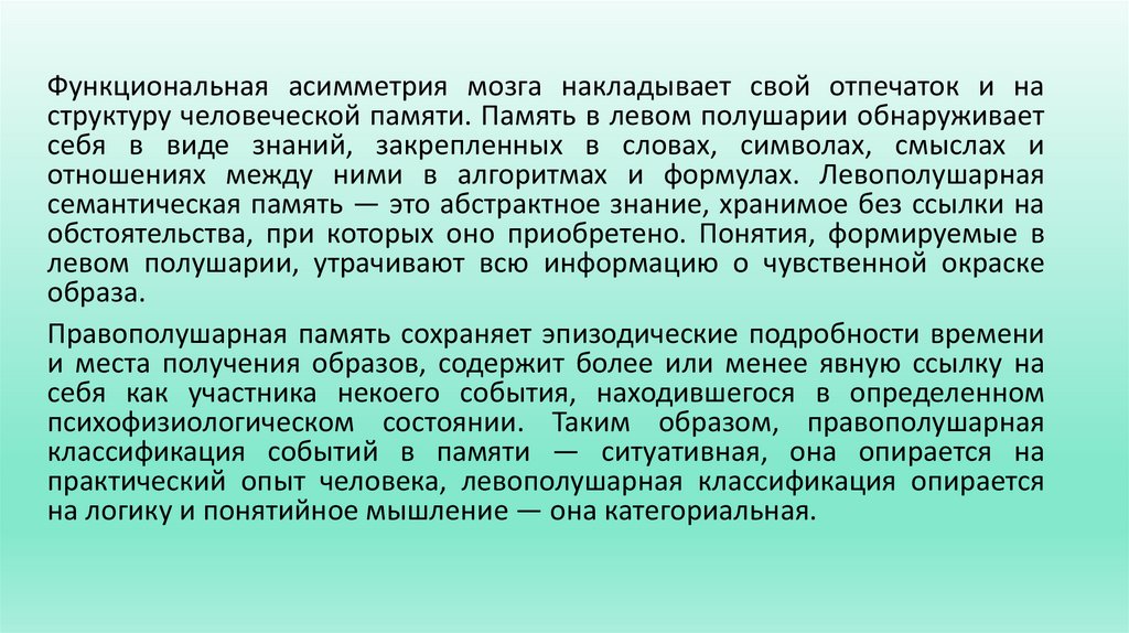 Функциональная асимметрия мозга накладывает свой отпечаток и наструктуру человеческой памяти. Память в левом полушарии обнаруживает