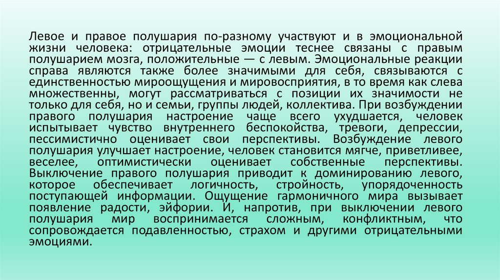 Левое и правое полушария по-разному участвуют и в эмоциональнойжизни человека: отрицательные эмоции теснее связаны с правым