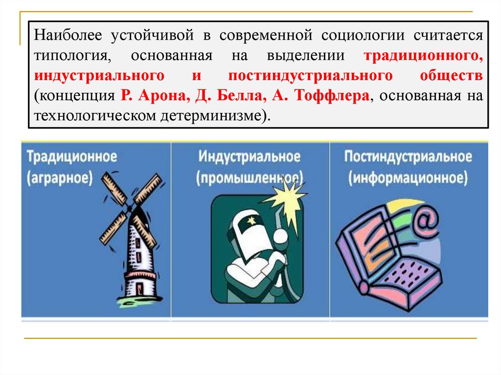 Наиболее устойчивой в современной социологии считаетсятипология, основанная на выделении традиционного,