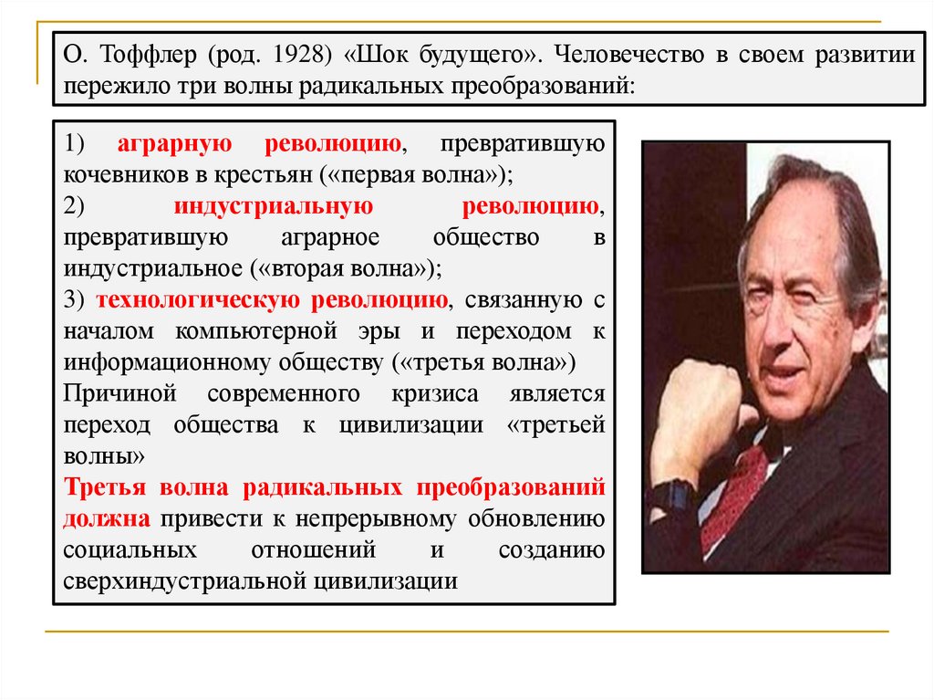 О. Тоффлер (род. 1928) «Шок будущего». Человечество в своем развитиипережило три волны радикальных преобразований: