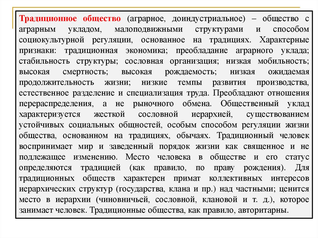 Традиционное общество (аграрное, доиндустриальное) – общество саграрным укладом, малоподвижными структурами и способом