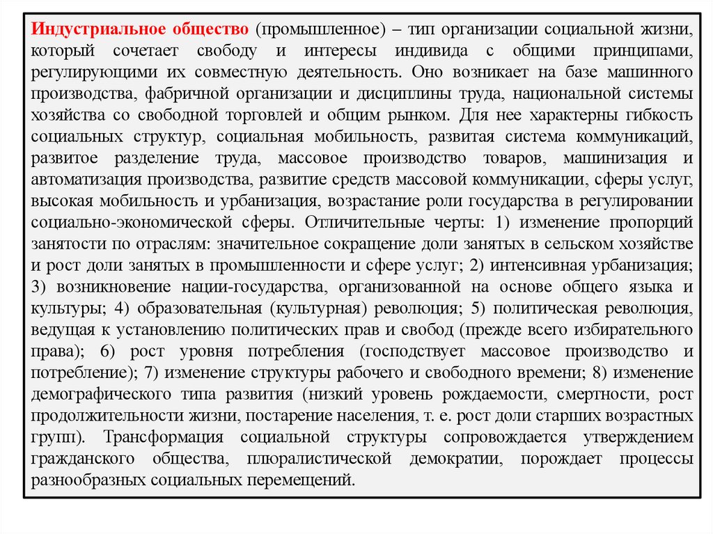 Индустриальное общество (промышленное) – тип организации социальной жизни,который сочетает свободу и интересы индивида с общими принципами,