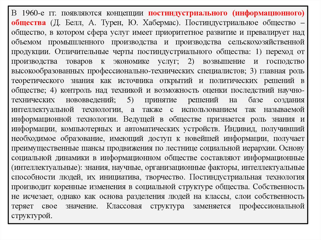 В 1960-е гг. появляются концепции постиндустриального (информационного)общества (Д. Белл, А. Турен, Ю. Хабермас). Постиндустриальное общество –