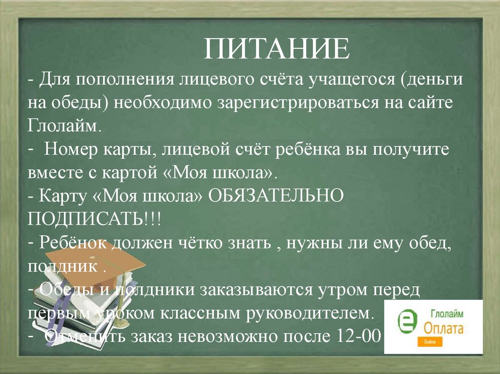 ПИТАНИЕ- Для пополнения лицевого счёта учащегося (деньги