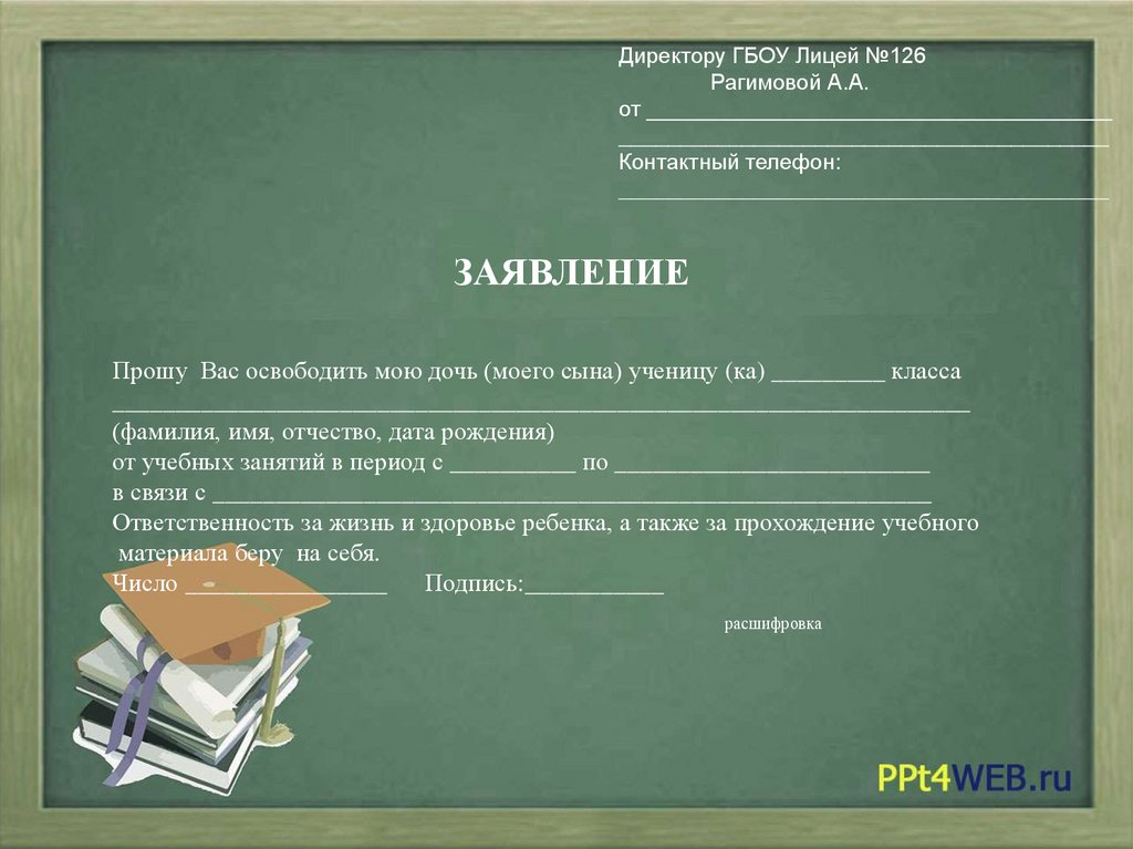 Прошу Вас освободить мою дочь (моего сына) ученицу (ка) _________ класса