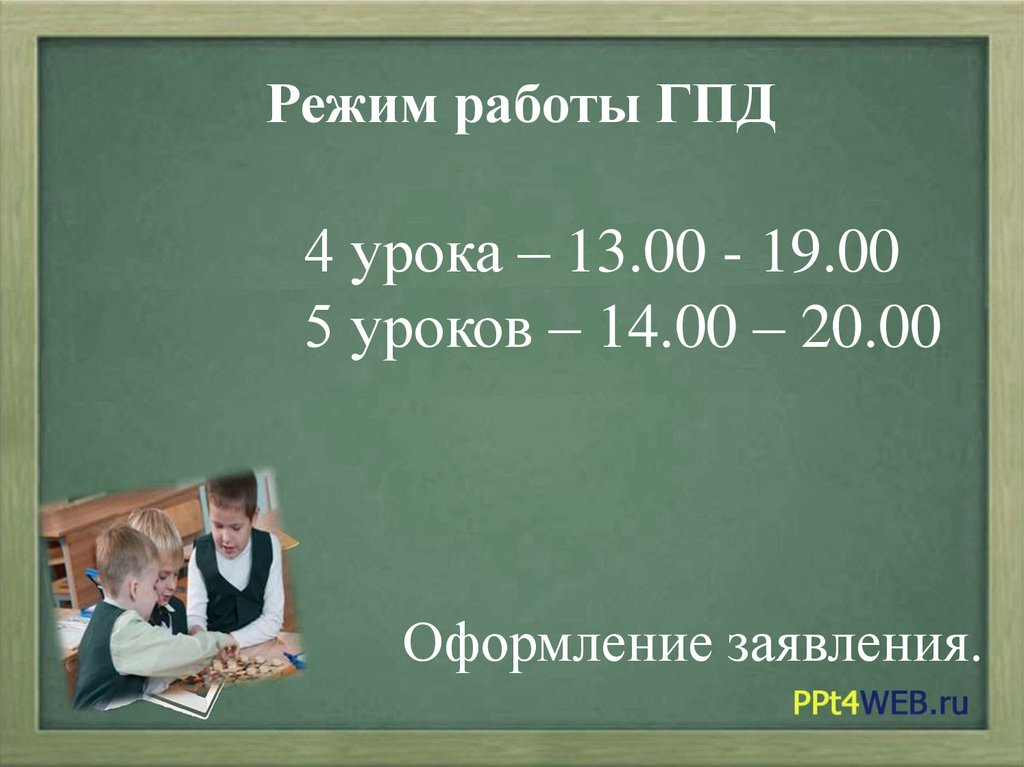Режим работы ГПД4 урока – 13.00 - 19.00