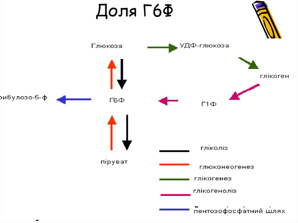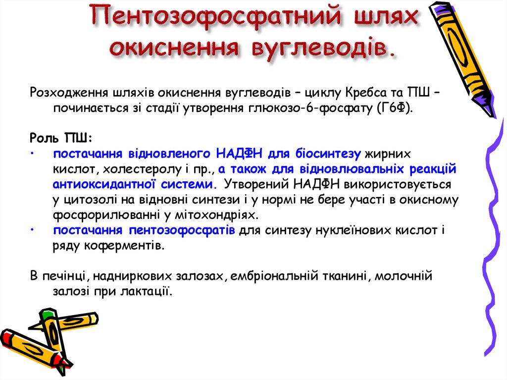 Розходження шляхів окиснення вуглеводів – циклу Кребса та ПШ –починається зі стадії утворення глюкозо-6-фосфату (Г6Ф).