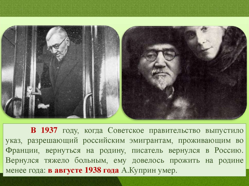 В 1937 году, когда Советское правительство выпустилоуказ, разрешающий российским эмигрантам, проживающим во