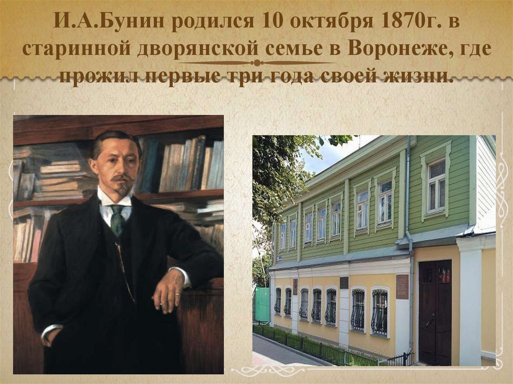 И.А.Бунин родился 10 октября 1870г. встаринной дворянской семье в Воронеже, где