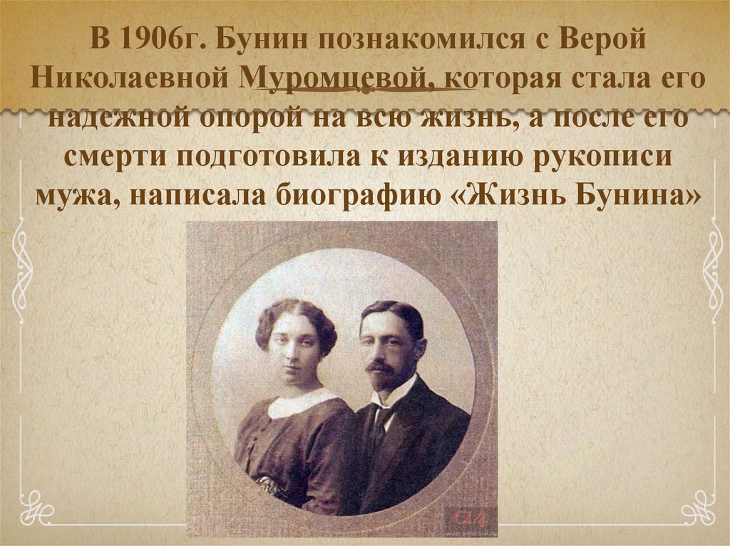 В 1906г. Бунин познакомился с ВеройНиколаевной Муромцевой, которая стала его
