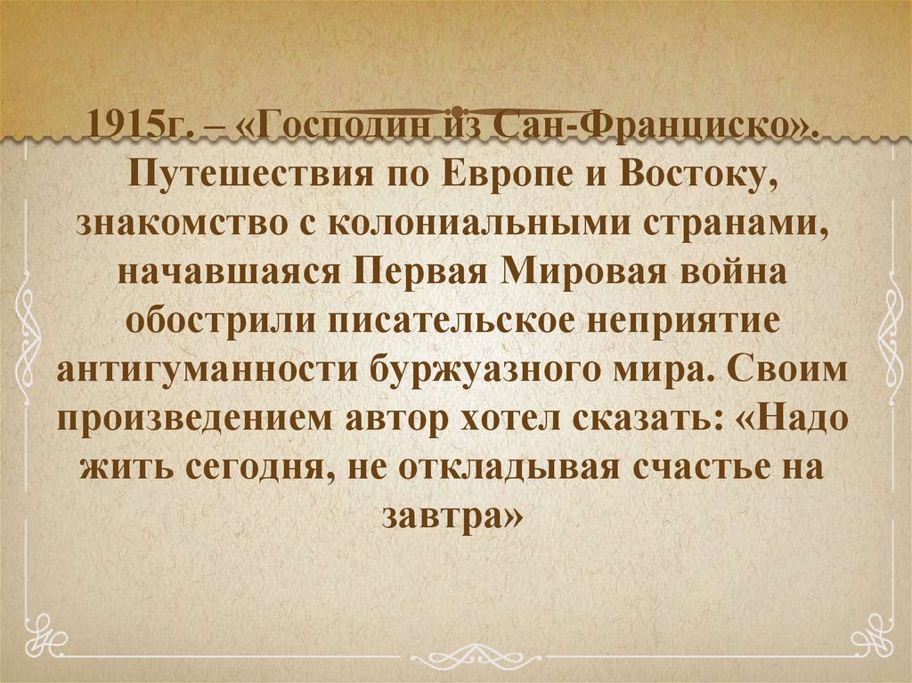 1915г. – «Господин из Сан-Франциско».Путешествия по Европе и Востоку,
