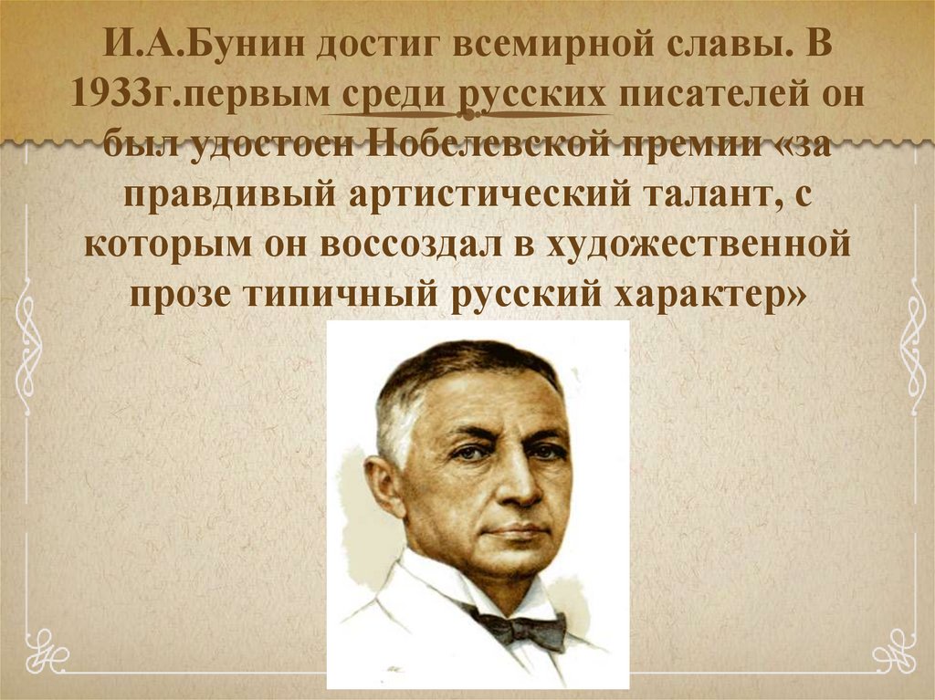 И.А.Бунин достиг всемирной славы. В1933г.первым среди русских писателей он