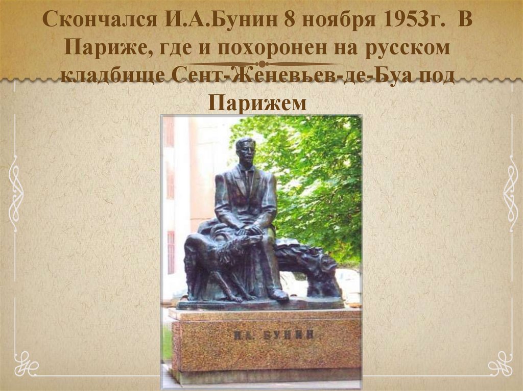 Скончался И.А.Бунин 8 ноября 1953г. ВПариже, где и похоронен на русском