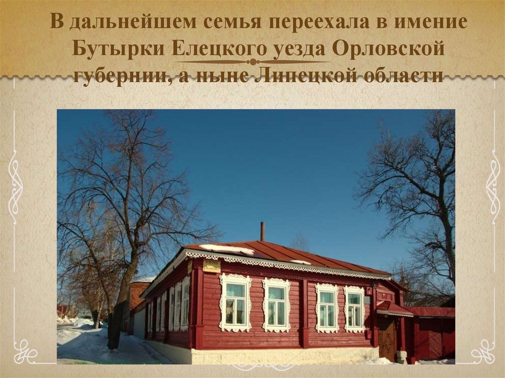 В дальнейшем семья переехала в имениеБутырки Елецкого уезда Орловской