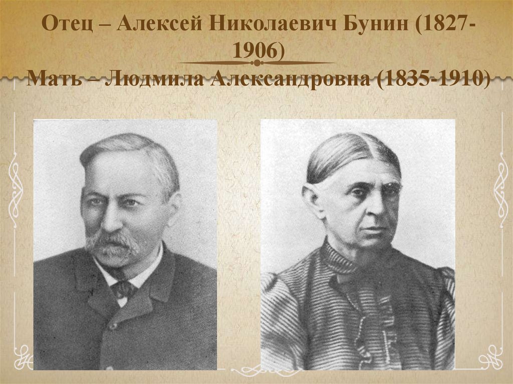 Отец – Алексей Николаевич Бунин (18271906)Мать – Людмила Александровна (1835-1910)
