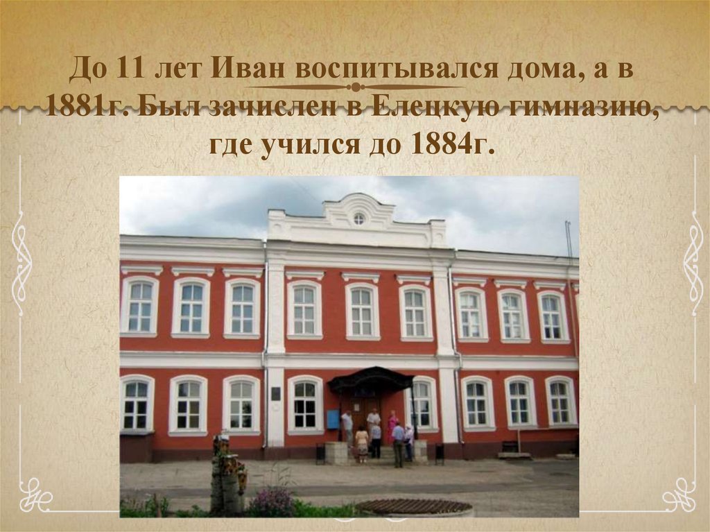 До 11 лет Иван воспитывался дома, а в1881г. Был зачислен в Елецкую гимназию,