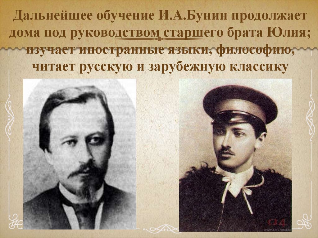 Дальнейшее обучение И.А.Бунин продолжаетдома под руководством старшего брата Юлия;