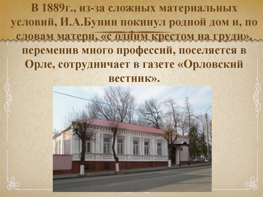 В 1889г., из-за сложных материальныхусловий, И.А.Бунин покинул родной дом и, по