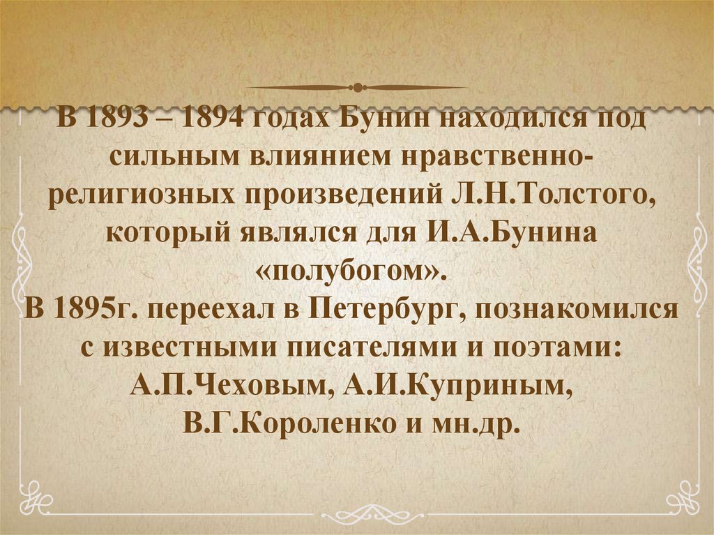 В 1893 – 1894 годах Бунин находился подсильным влиянием нравственнорелигиозных произведений Л.Н.Толстого,