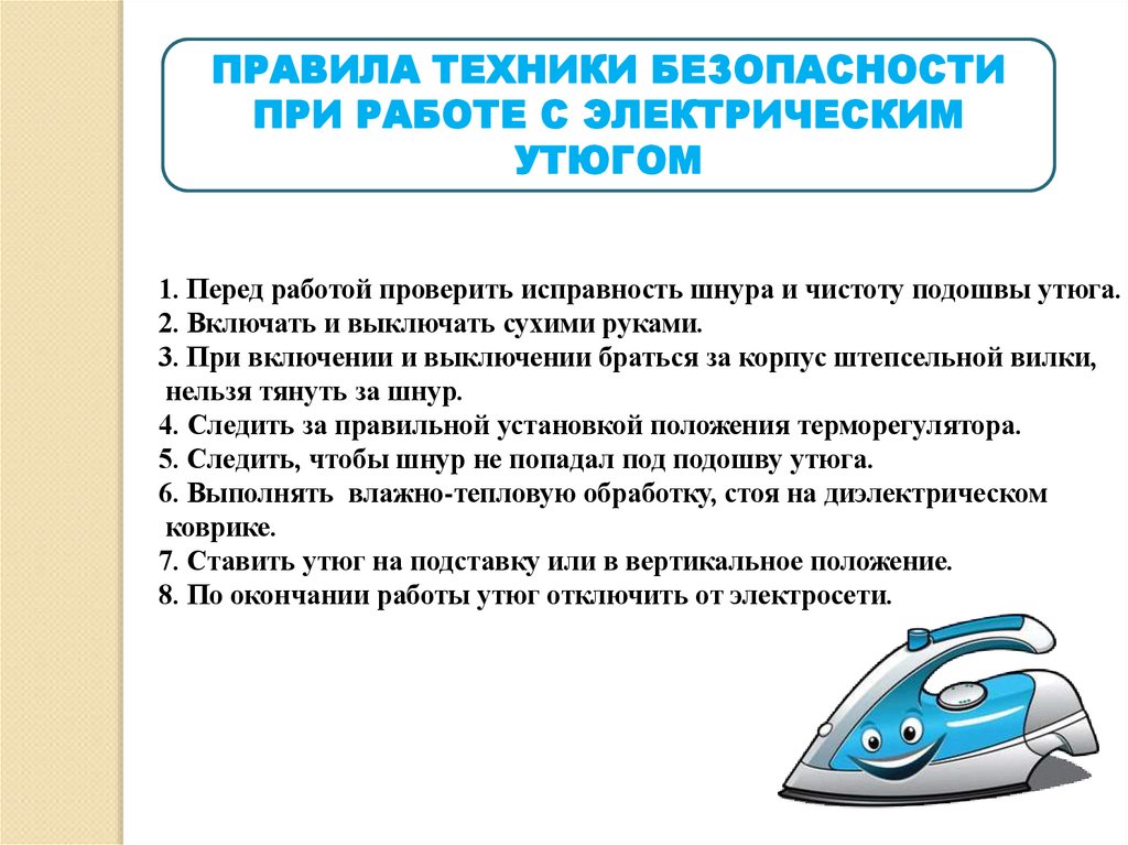 Техника безопасности на уроках технологии. Правила техники безопасности при работе с электрическим утюгом