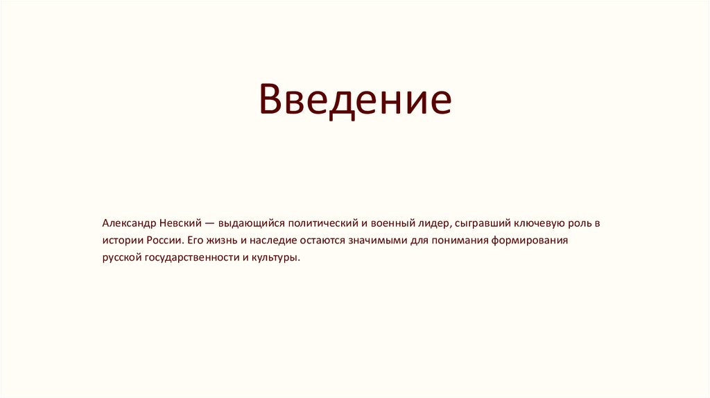 ВведениеАлександр Невский — выдающийся политический и военный лидер, сыгравший ключевую роль в