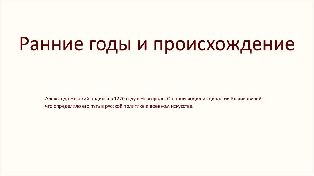 Ранние годы и происхождениеАлександр Невский родился в 1220 году в Новгороде. Он происходил из династии Рюриковичей,