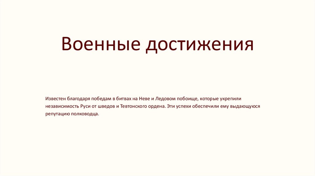 Военные достиженияИзвестен благодаря победам в битвах на Неве и Ледовом побоище, которые укрепили