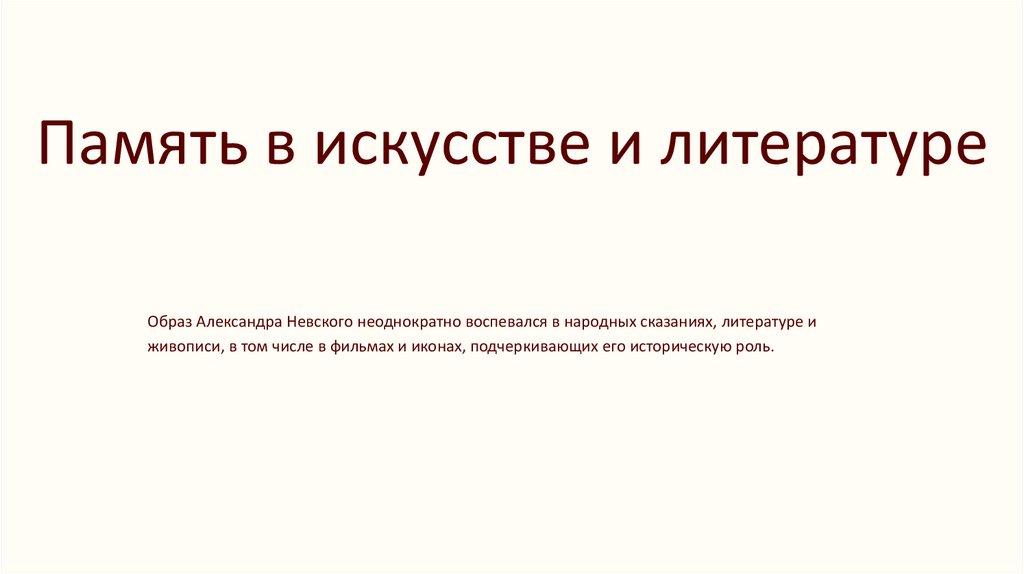 Память в искусстве и литературеОбраз Александра Невского неоднократно воспевался в народных сказаниях, литературе и