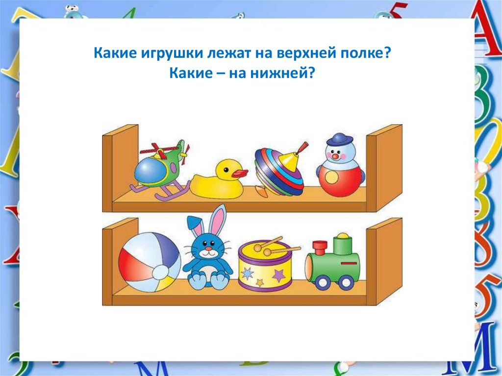 Какие игрушки лежат на верхней полке?Какие – на нижней?