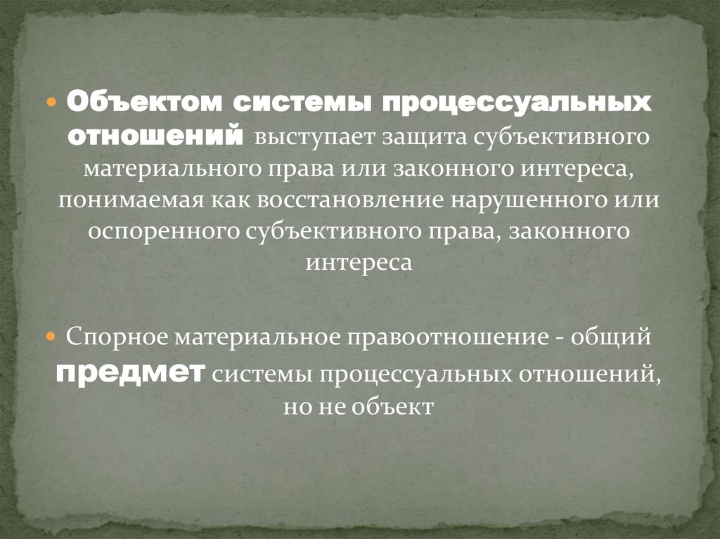 Объектом системы процессуальныхотношений выступает защита субъективного