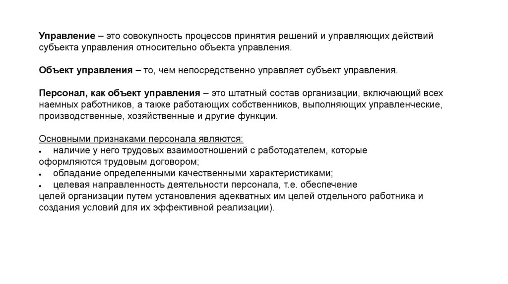 Персонал, как объект управления – это штатный состав организации, включающий всех